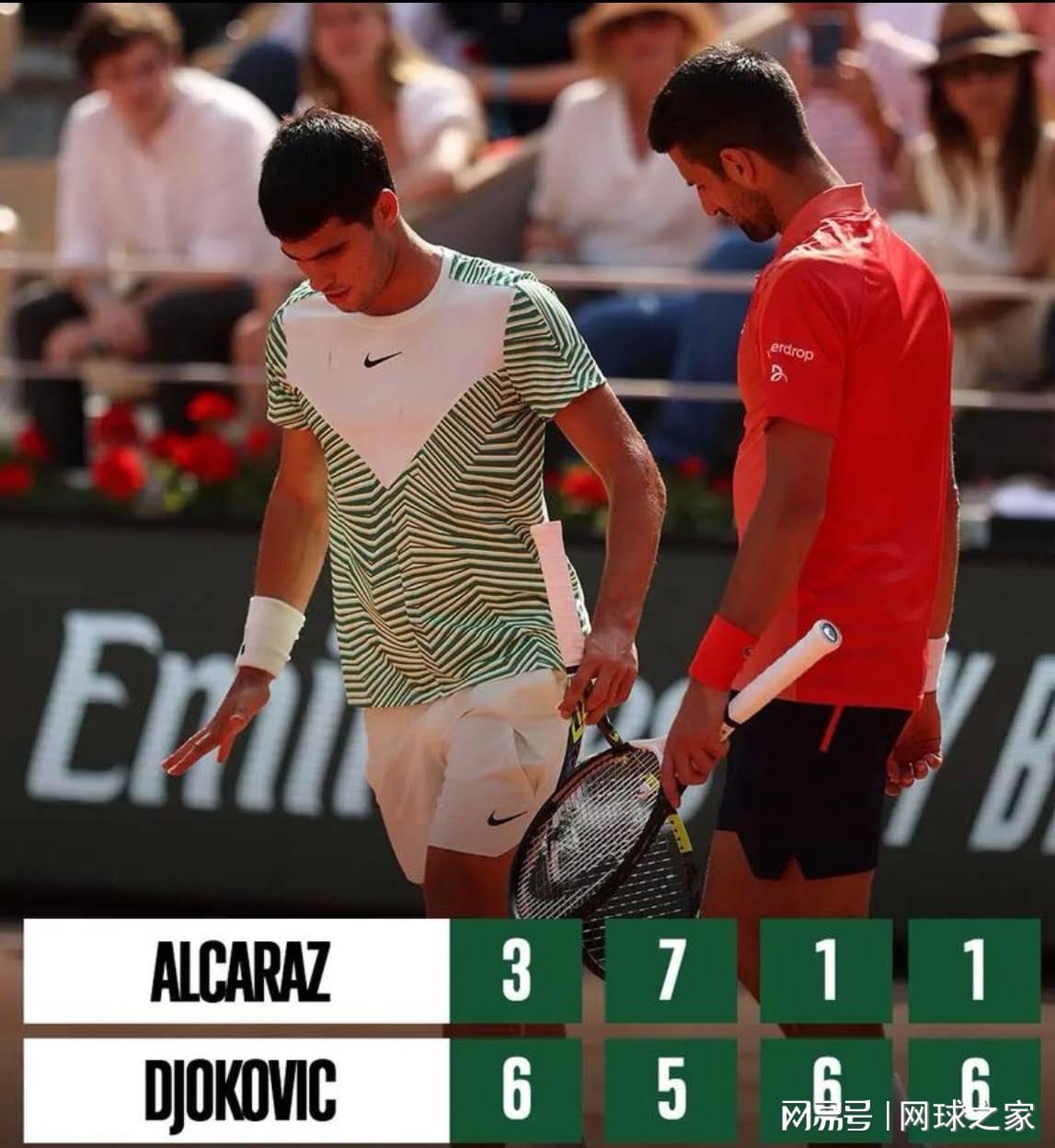 2023年法网半决赛,两人职业生涯第二次交锋,年轻的阿尔卡拉斯心理准备不够充分,比赛之中过于紧张,导致双腿肌肉抽筋,四盘败下阵来。既非常懊恼,又十分不甘的阿尔卡拉斯呀,双眼泛红,噙满泪水。